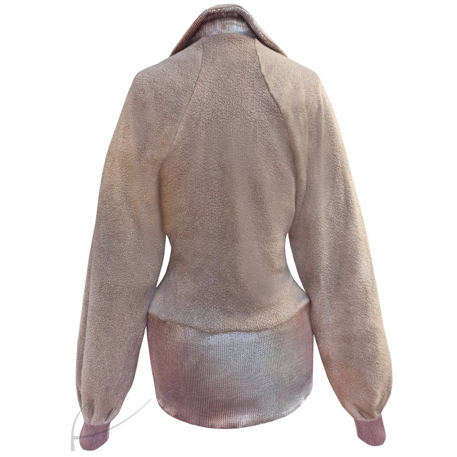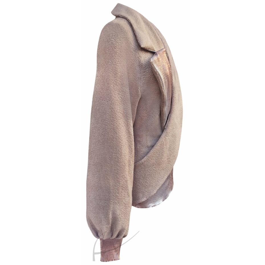Beżowo- złoty żakietowy, sweter z kołnierzem i szerokimi rękawami reglanowymi.