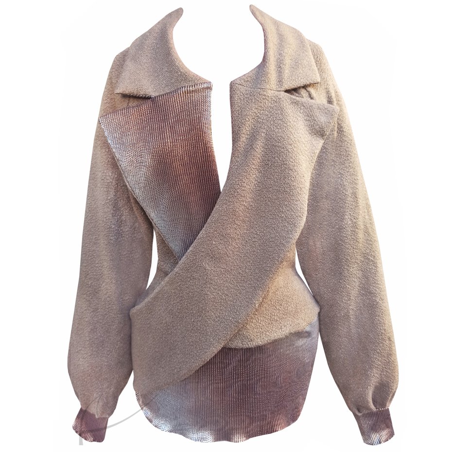 Projekt: sweter kopertowy z dzianiną ściągaczową na linii bioder i mankietów.