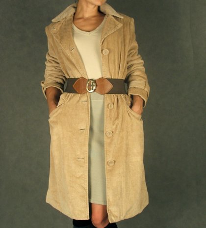 Beżowy płaszczyk z grubego i szerokiego sztruksu. Zapinany na guziki. Po bokach dwie kieszenie, na rękawach patki. Szlufki na pasek, którego niestety brak, ale każdy brązowy świetnie będzie do niego pasował. Na podszewce.