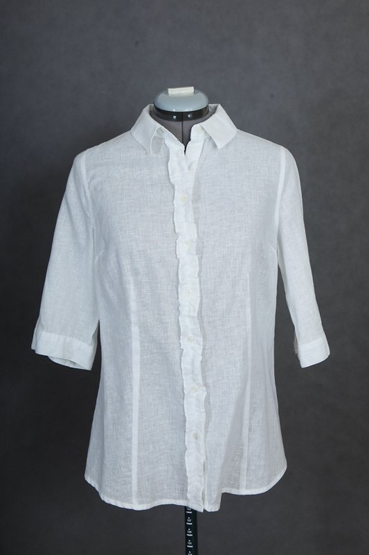 biała bluzka z lnu z domieszką bawełny z ozdobną falbanką przy guzikach, rękaw 3/4 z mankietami na guziki