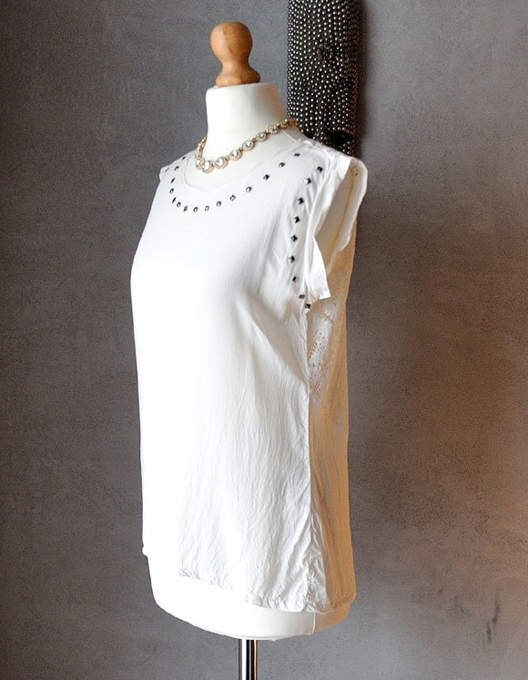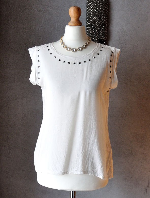 Krój luźny, t-shirtowy, z mikro rękawkami. Z przodu wokół dekoltu i przy ramionach przytwierdzone metalowe dżety w odcieniu hematytu.