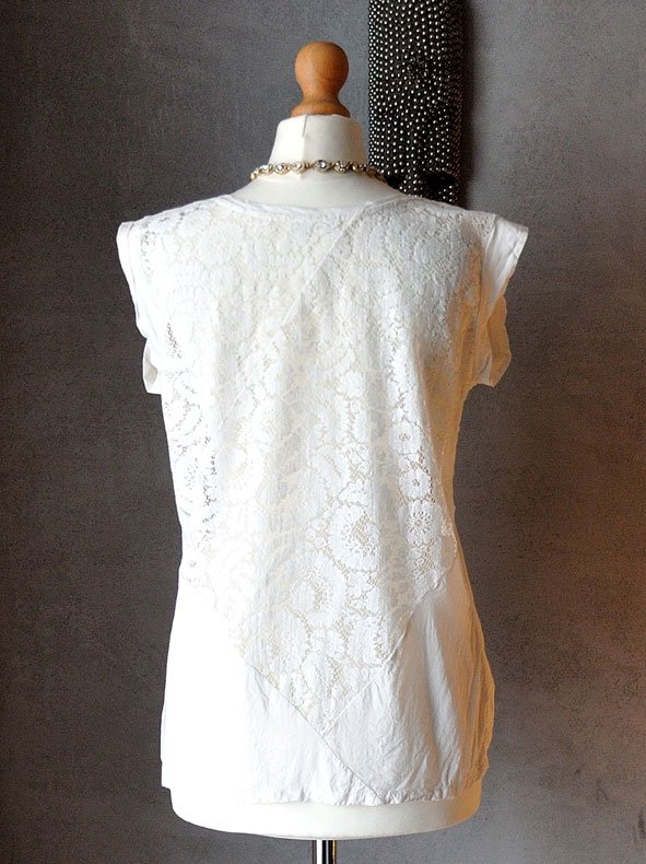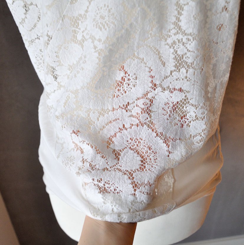 Uszyty z dwóch rodzajów kremowobiałego materiału (biel jest przełamana delikatnym żółtym tonem): przód i kawałek tyłu to cienka, nieco prześwitująca wiskoza; natomiast tył zrobiony jest z koronki z ładnym, kwiatowym wzorem.