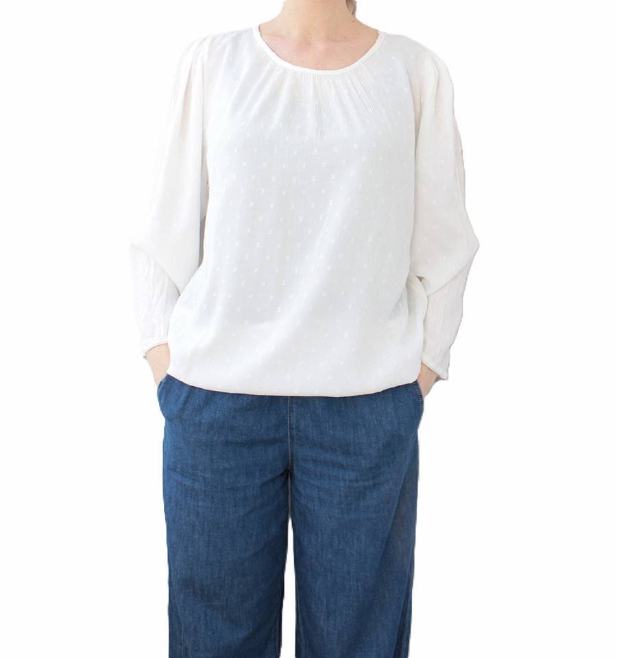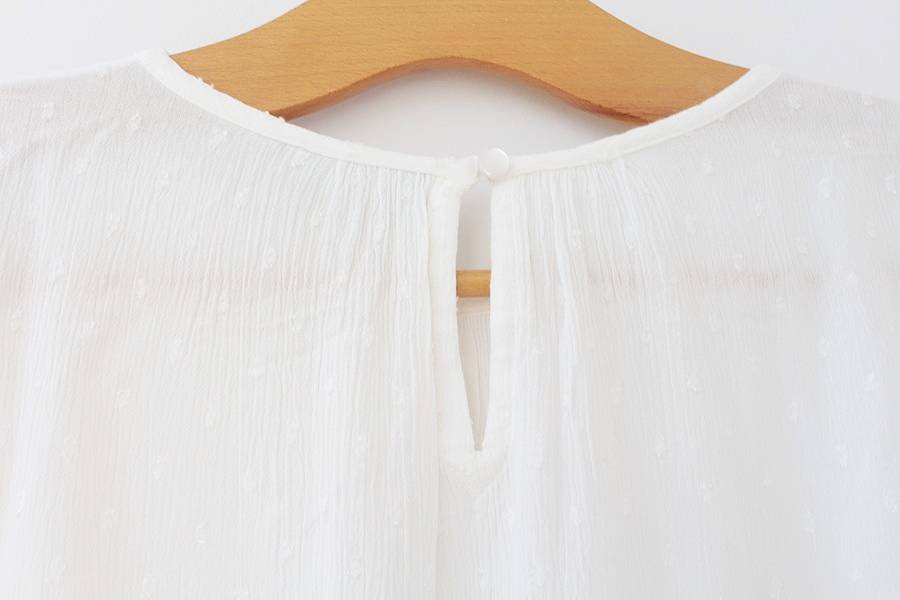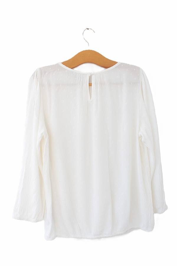 Bluzka vintage w kolorze białym o zwiewnym, eleganckim fasonie. Wytłaczana w delikatne kropeczki.