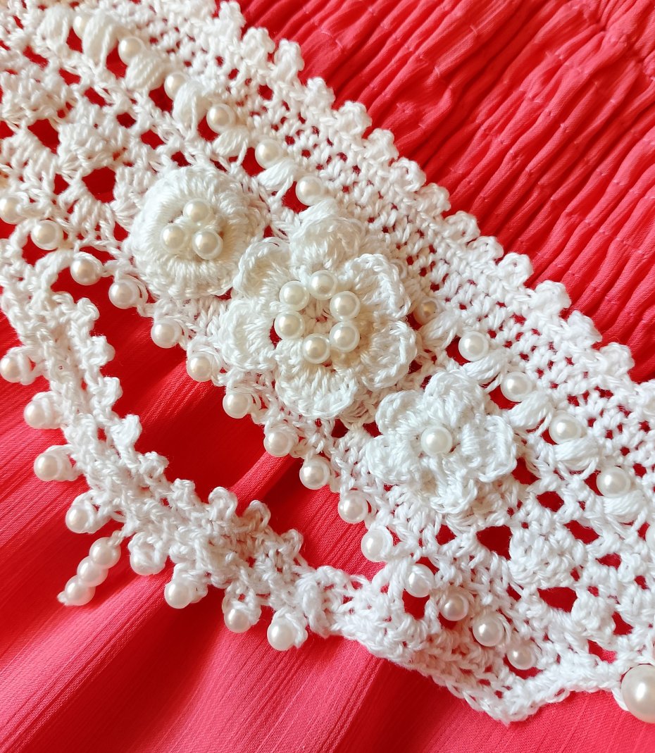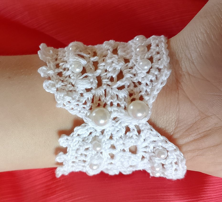 Bransoletka wykonana koronkowym wzorem, ozdobiona perłowymi koralikami. Jest bardzo delikatna i przyjazna dla skóry, ponieważ została wykonana z bawełny 100%. Nie uczula. Łatwa do samodzielnego zapięcia.