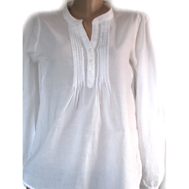 Bluzka o prostym kroju A firmy H&M, na stójce, z długim rękawem z możliwością regulacji, zapinana z przodu na 3 guziczki. Z przodu ozdobne zakładki. Materiał przewiewny, lekko prześwitujący. Rękaw o długości 45cm (mierzony po wewnętrznej stronie). Idealna do leginsów lub jeansów rurek. Wymiary na płasko: biust 47 cm, talia 50 cm, biodra 55 cm. Długość bluzki mierzona przodem od ramienia 62 cm. . .