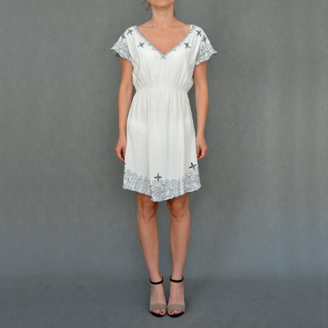 Śliczniutka, letnia biała sukieneczka z czarnymi haftowanymi zdobieniami. Ma luźniejszy dekolt, w talii gumkę. Bardzo przewiewna, będzie dobra na gorące dni. Marka Atmosphere.
