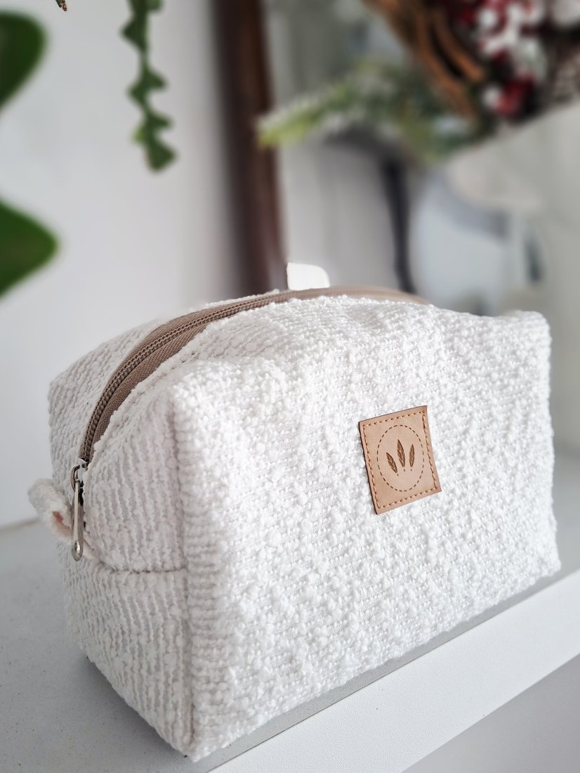 Średniej wielkości kosmetyczka z fantazyjnej tkaniny typu baranek/boucle