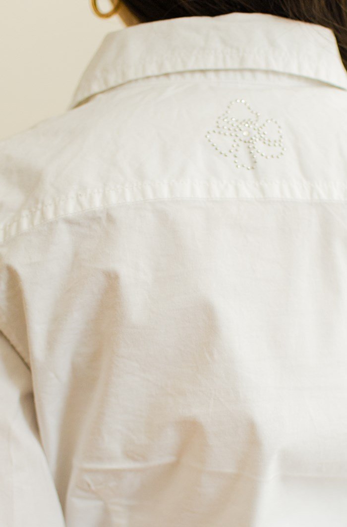 Biała koszula z dżetami na karku.