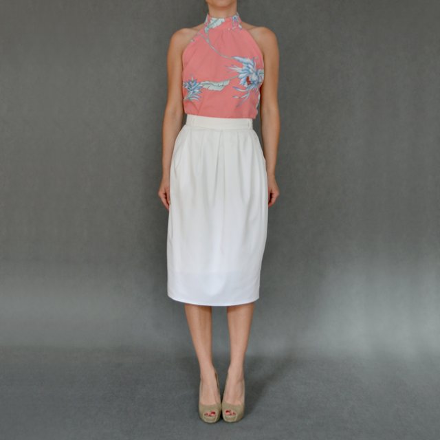 Biała {leciutko złamana} spódniczka vintage o przepięknym kroju. Fason dość prosty, z kieszonkami po bokach. Całego smaczku nadają kontrafałdy z przodu, które świetnie się układają. Na podszewce. Z tyłu zapinana na zamek i guziczek. Polecam.
