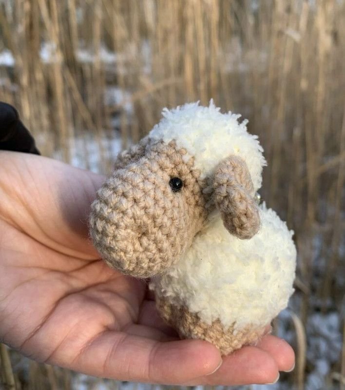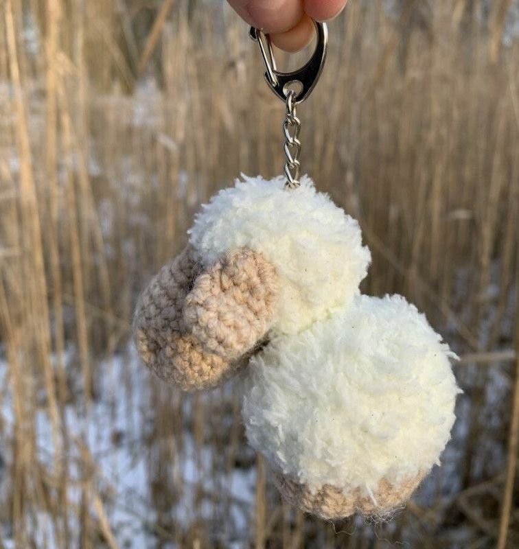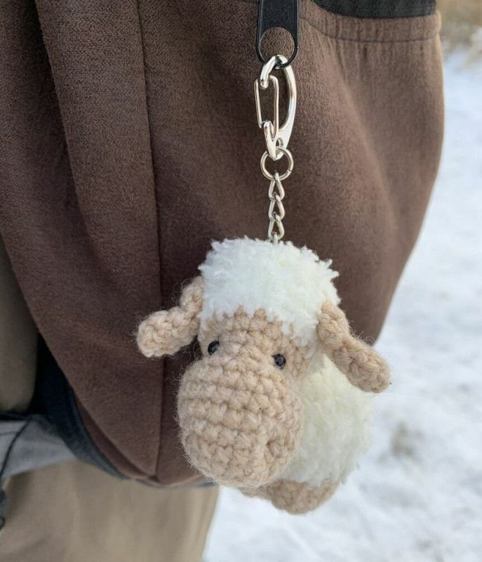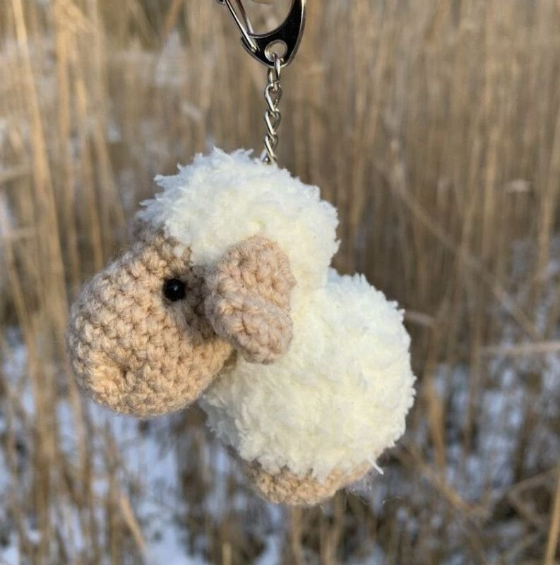 Sympatyczny brelok owieczka wykonany ręcznie z fantazyjnej włóczki na szydełku.