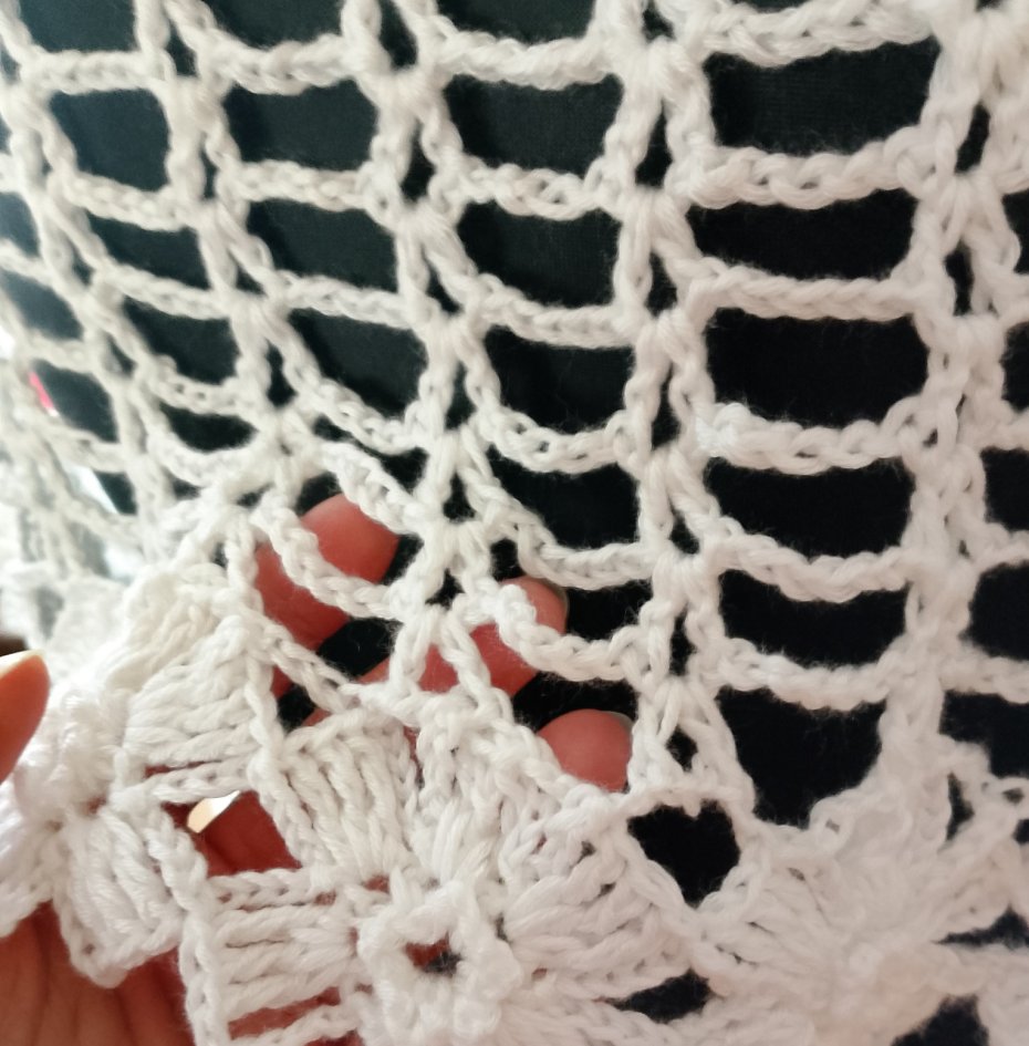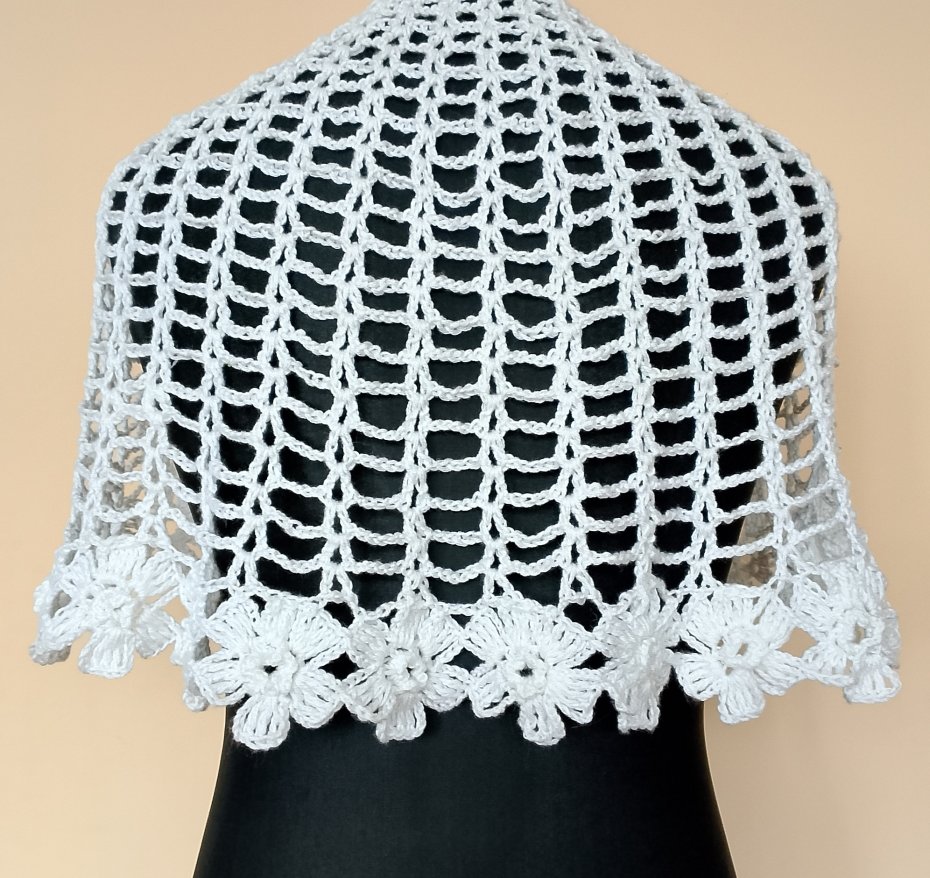 Śliczna komunijna pelerynka wykonana w całości ręcznie z wyjątkowej jakości włóczki, delikatnej w dotyku, o perłowym połysku, przelewającej się przez palce i jedwabiście gładkiej. Zakończona pięknymi szydełkowymi kwiatami.