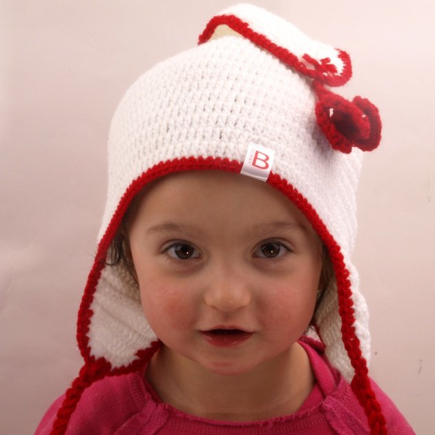 czapka - pilotka, z nausznikami i rożkiem. Zwisający rożek i nauszniki wykończone czerwonymi serduszkami. obwód - 48-50 -cm na 2-3latka Podobne czapki dziergamy również na większe główki i całkiem duże głowy :) W celu zamówienia innego rozmiaru bądź koloru, prosimy o kontakt przez formularz kontaktowy. Zapraszamy!
