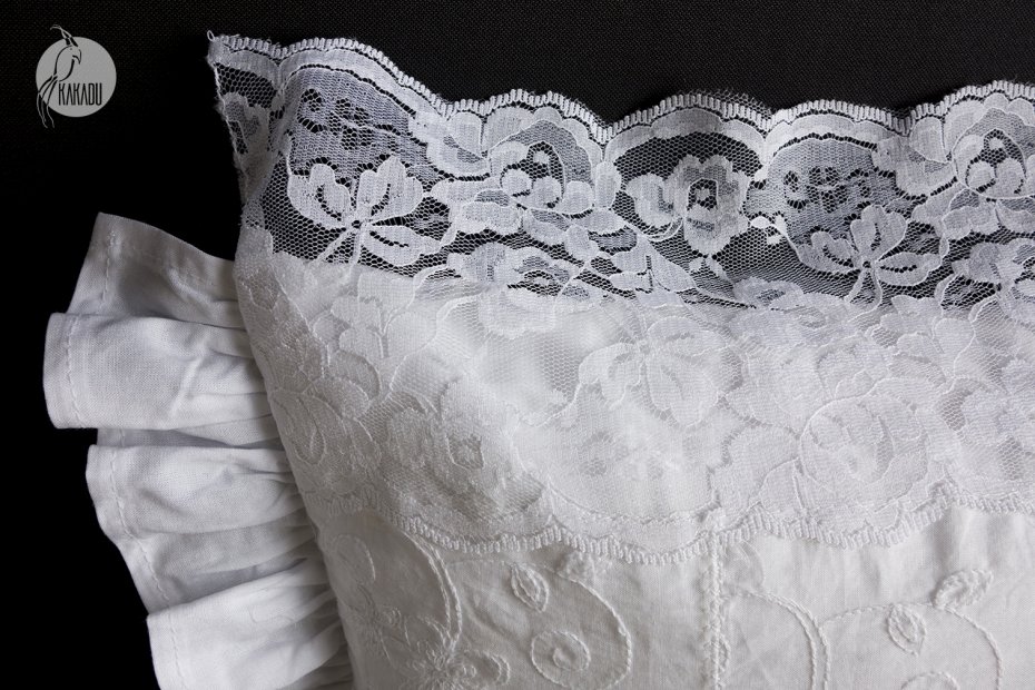 Z przodu piękny batyst haftowany w roślinne motywy z naszytymi trzema koronkami. Jedna z nich wystaje poza poduszkę.