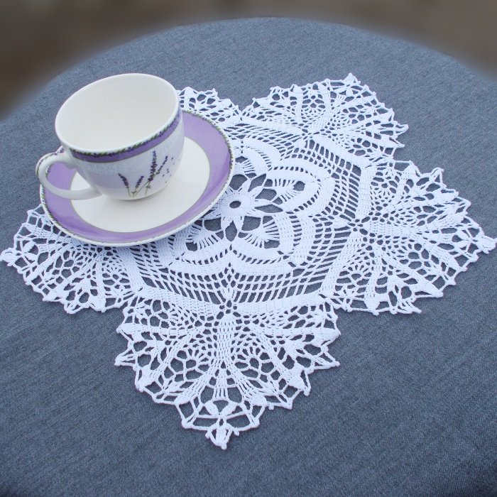 Biała, oryginalna w kształcie serwetka wykonana z bawełnianego kordonka