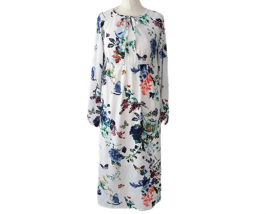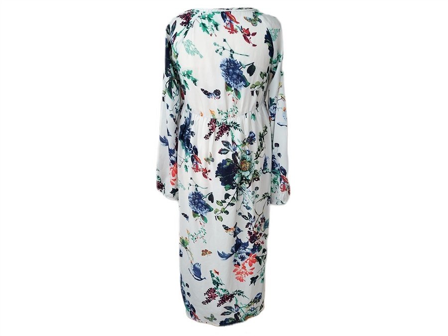 Biała sukienka w kwiaty. Fason odcięty pod biustem.