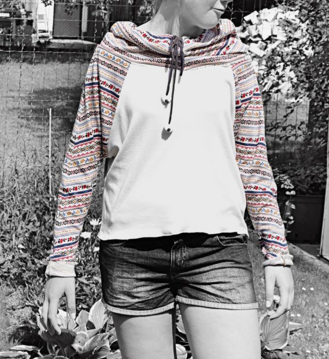 Bluza oversize wykonana została z białej, elastycznej dzianiny oraz dzianiny we wzorki. Luźny krój, z szerokim golfem zawiązywanym na sznurek. Przód bluzy nieco krótszy od tyłu . Bardzo wygodna. Rozmiar M