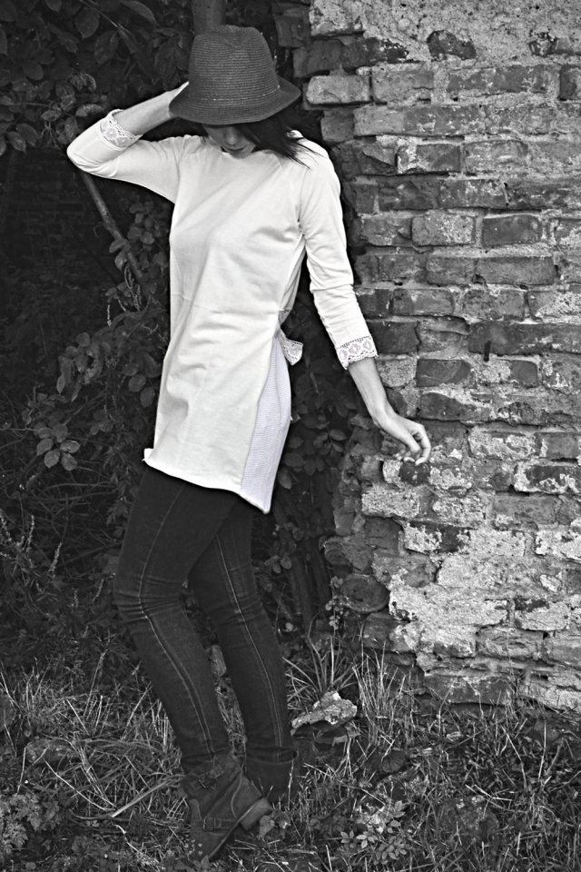 Bluza/Tunika wykonana została z białej średniej grubości dzianiny dresowej oraz białej bawełny. Z tyłu poziomy pasek wykonany z bawełnianej koronki ( można go wiązać z przodu, z tyłu, jak kto woli :). Rękawki 3/4 wykończone również koronką, wykończenie dołu i dekoltu satyną. Prosty krój, bardzo wygodna, asymetryczna, przód nieco krótszy od tyłu. Rozmiar S