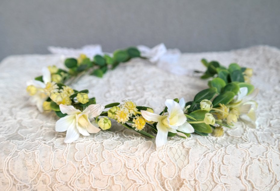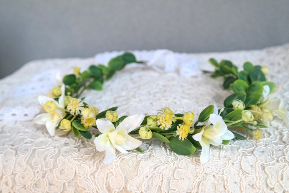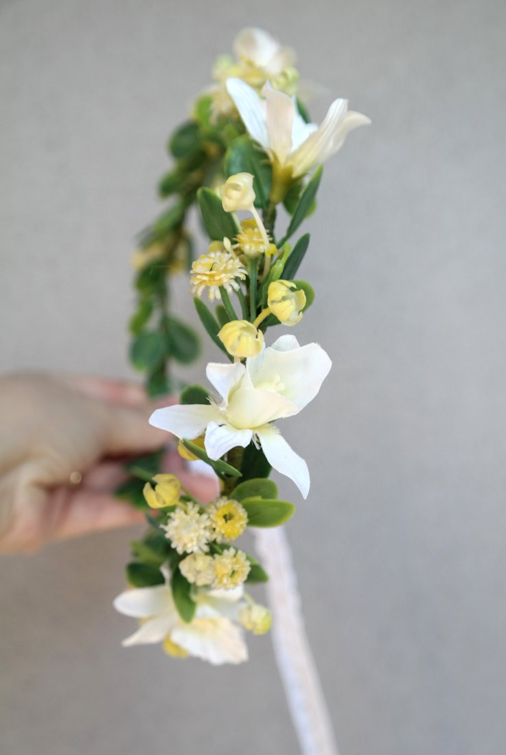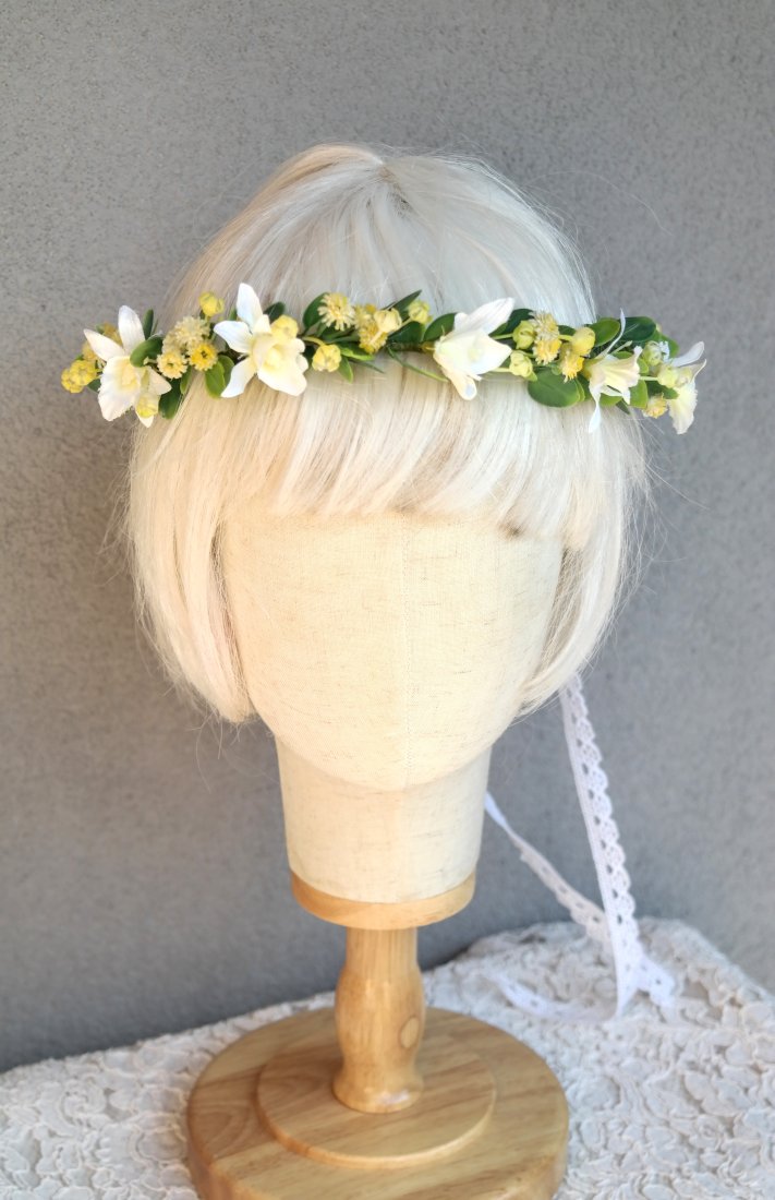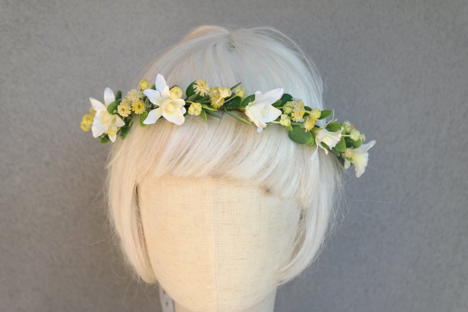 To wianek, który łączy w sobie świeżość wiosny i elegancję – idealny zarówno na komunię, jak i ślub.