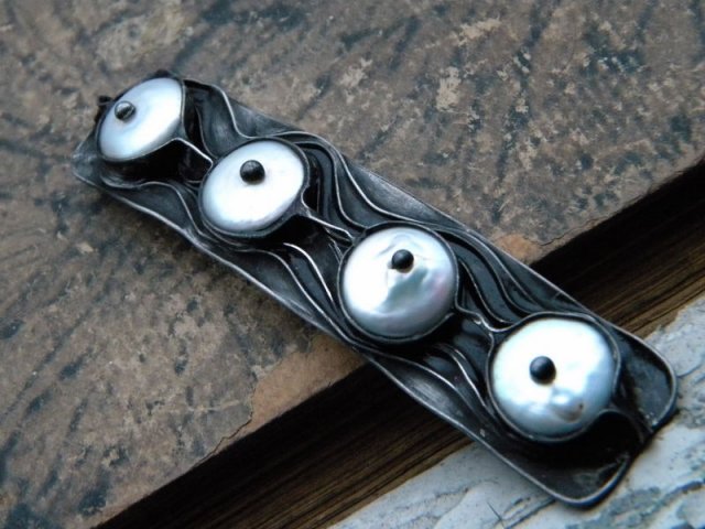 klamra wykonana z duzych, białych ,płaskich pereł w ocynowanej miedzi. stylizowana na stare srebro. wymiary 10cm x 2,3cm.