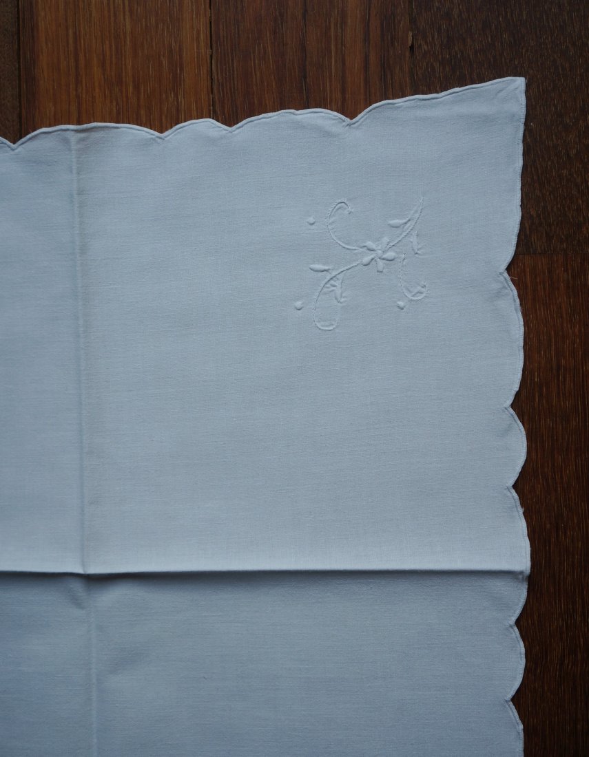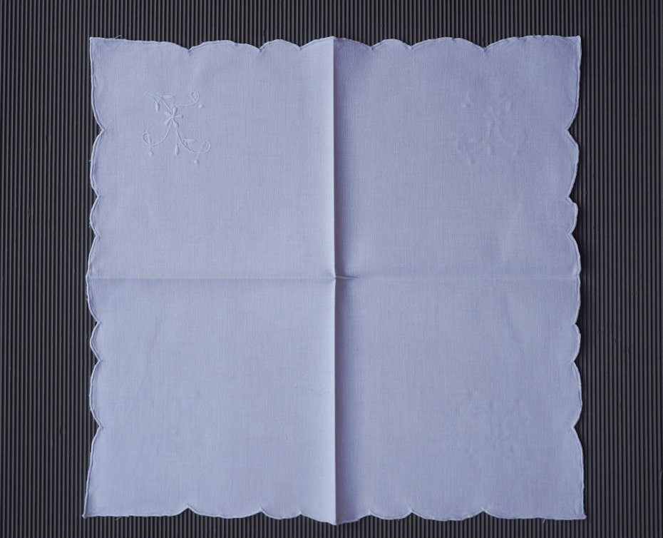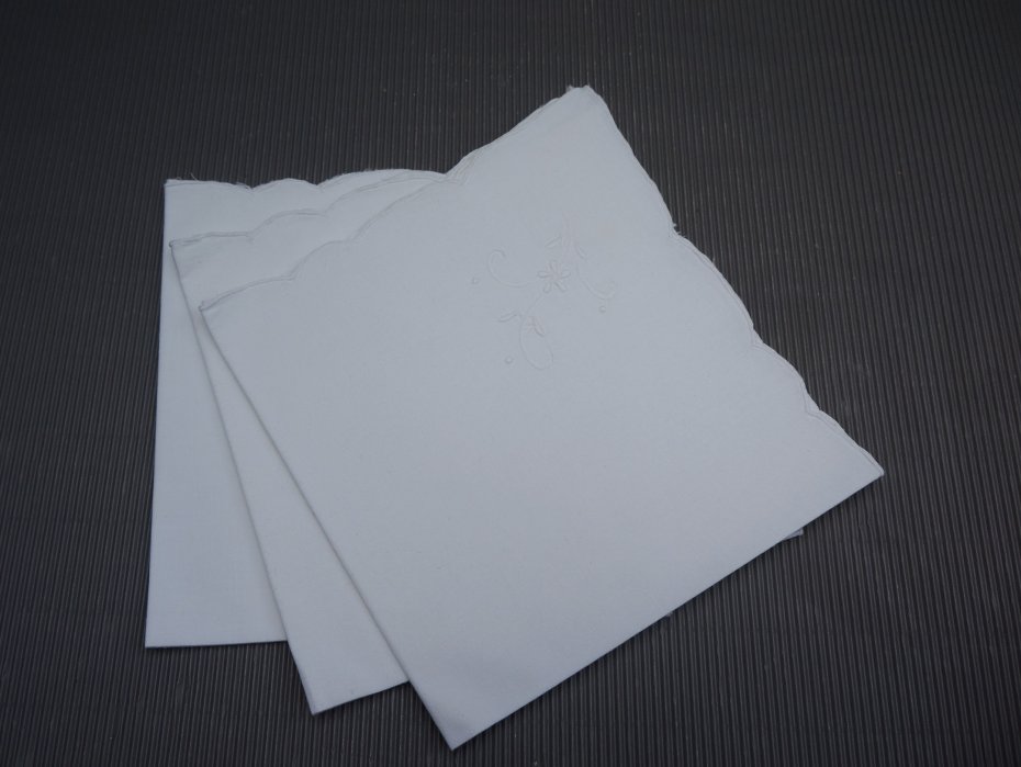 Trzy, białe serwetki. Ozdobione delikatnym, maszynowym haftem. Tkanina naturalna - bielone płótno. Lekko usztywnione. Stan bardzo dobry.