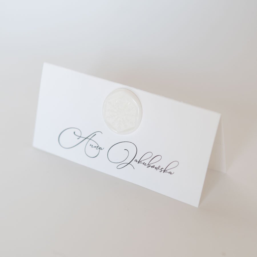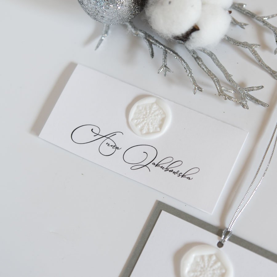 Winietki powstały z białego papieru z kaligraficznym napisem i białą pieczęcią z motywem śnieżynki.