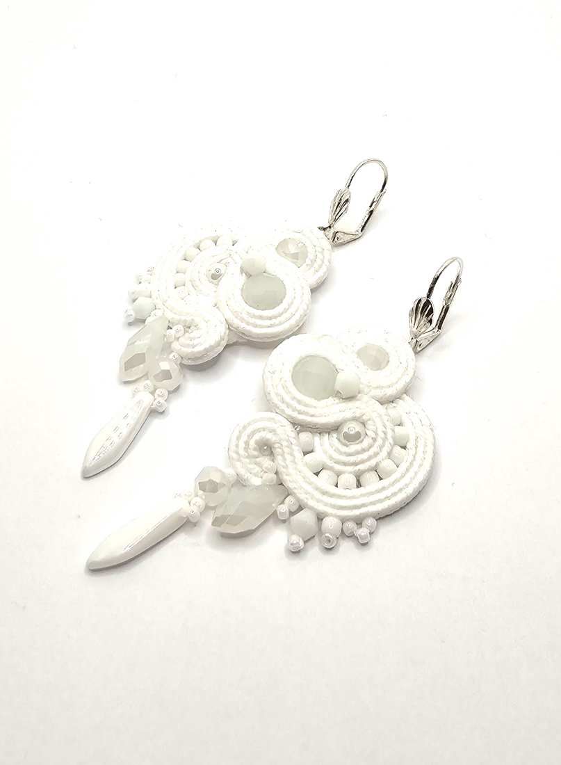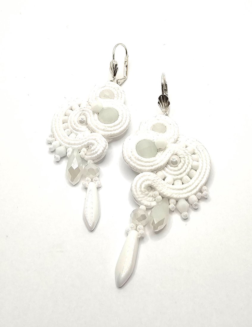 Białe szklane kulki otoczone polskimi sznurkami sutasz oraz szklanymi czeskimi i japońskimi koralikami o rożnych kształtach i wielkościach. Dół kolczyków zdobią szklane wiszące koraliki w kolorze perłowym oraz szklane kryształki. Kolczyki zawieszone na ozdobnych biglach angielskich w kolorze srebrnym.