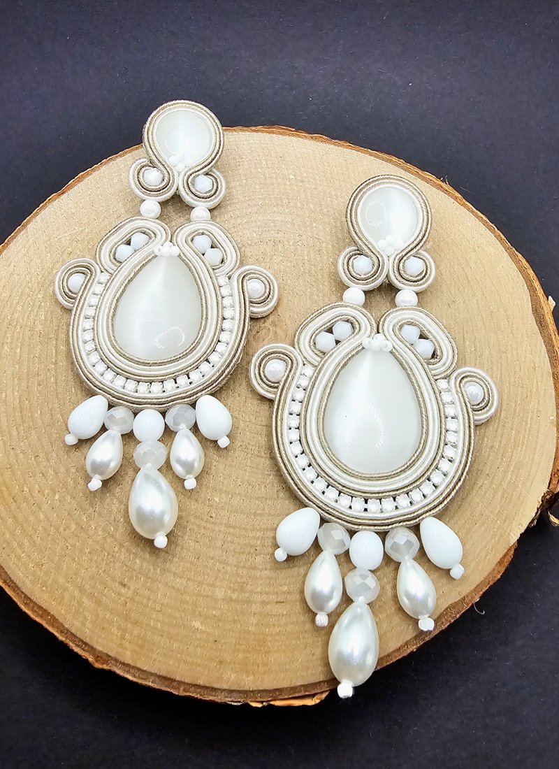 Biało beżowe długie kolczyki sutasz z kocim okiem