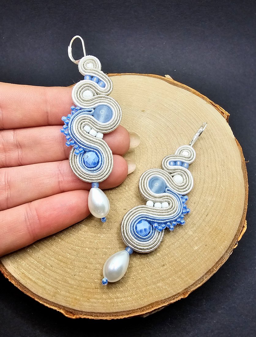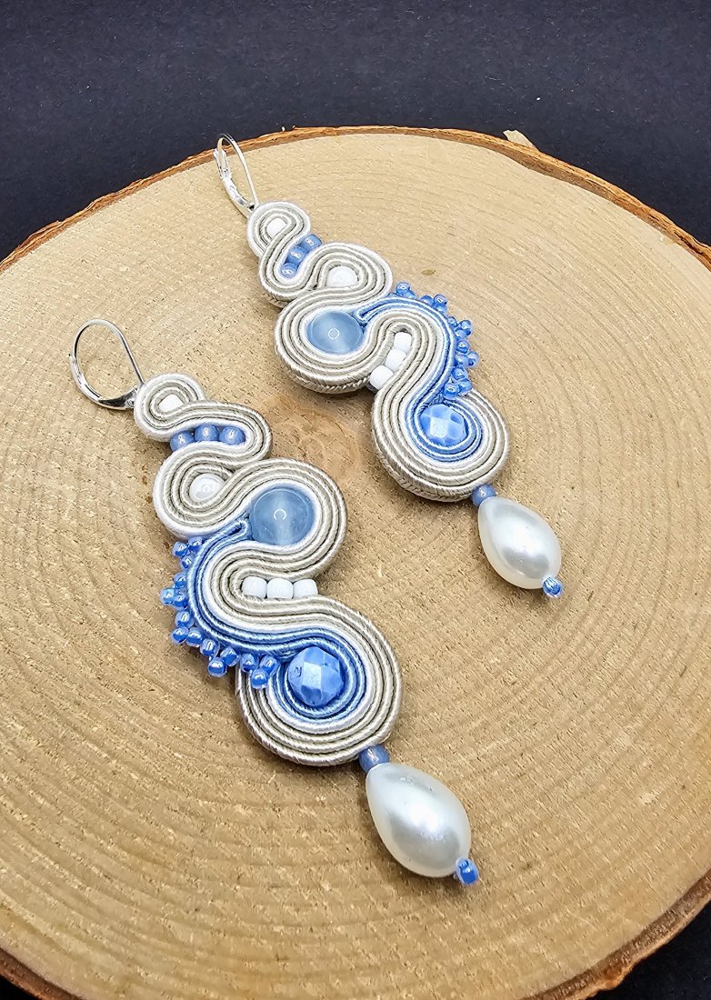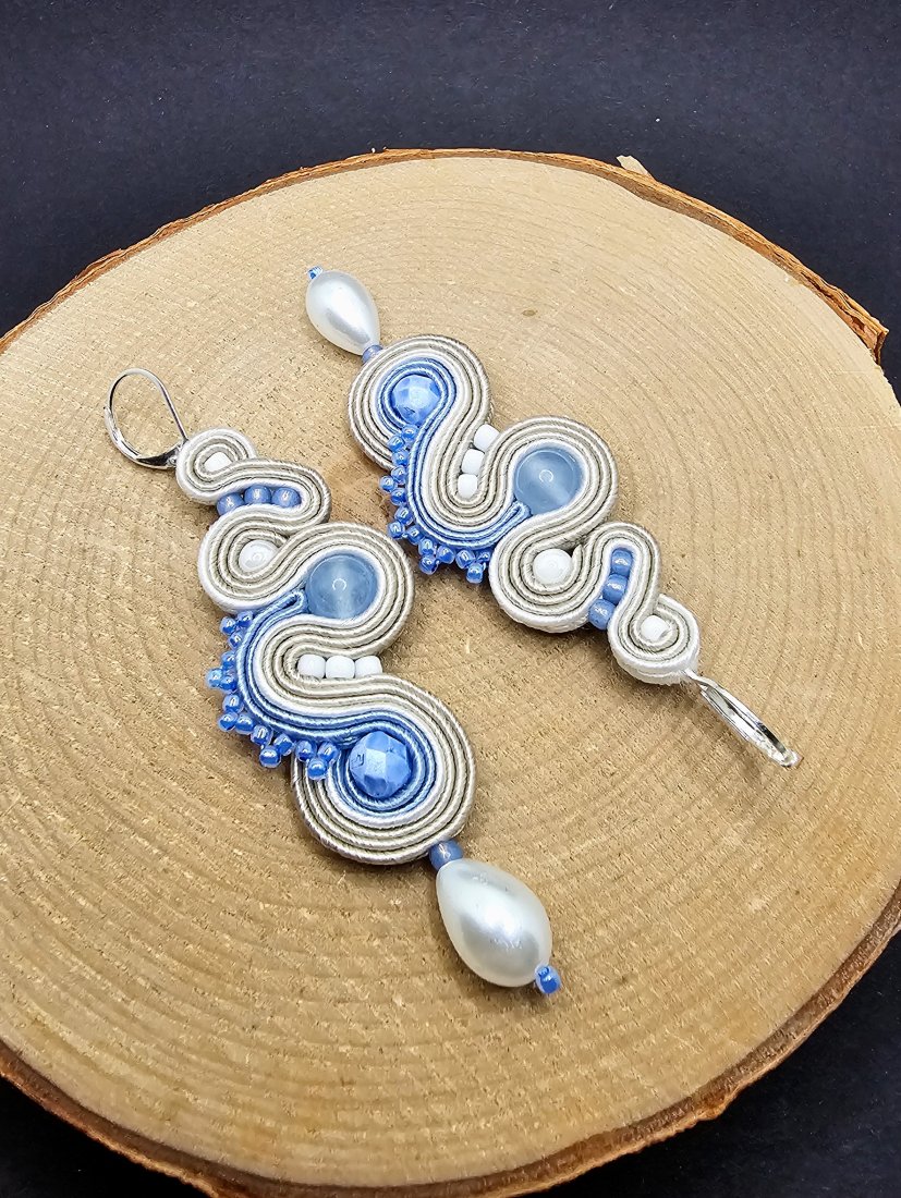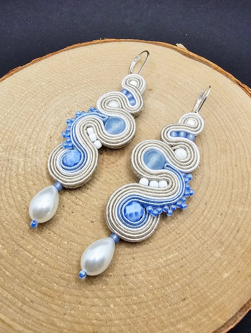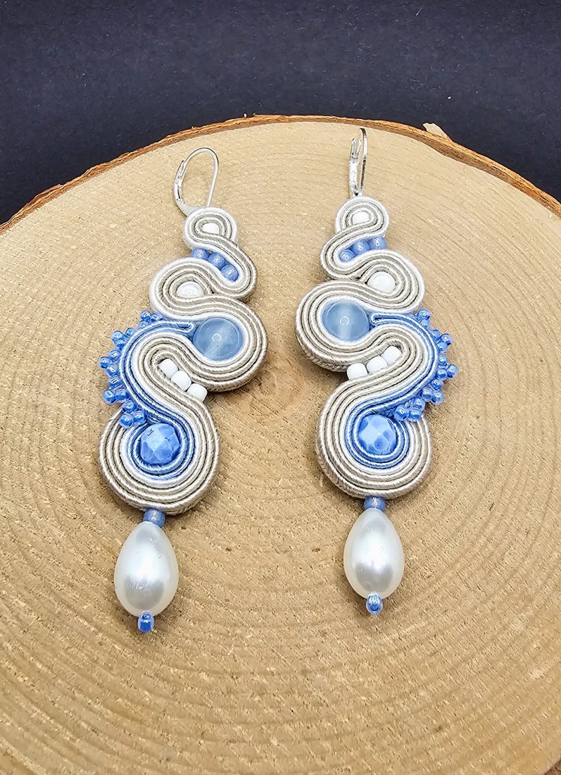 Kulki jadeitu w kolorze błękitnym otoczone sznurkami sutasz oraz szklanymi czeskimi i japońskimi koralikami o rożnych kształtach i wielkościach. Dół kolczyków zdobią perłowe krople. Kolory w kolczykach: biały, beżowy, błękitny. Kolczyki zawieszone na biglach angielskich w kolorze srebrnym.