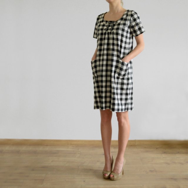 Prosta sukienka z kieszonkami w biało czarną kratkę. Krój prosty, szerszy. Z bienkiej flanelki.