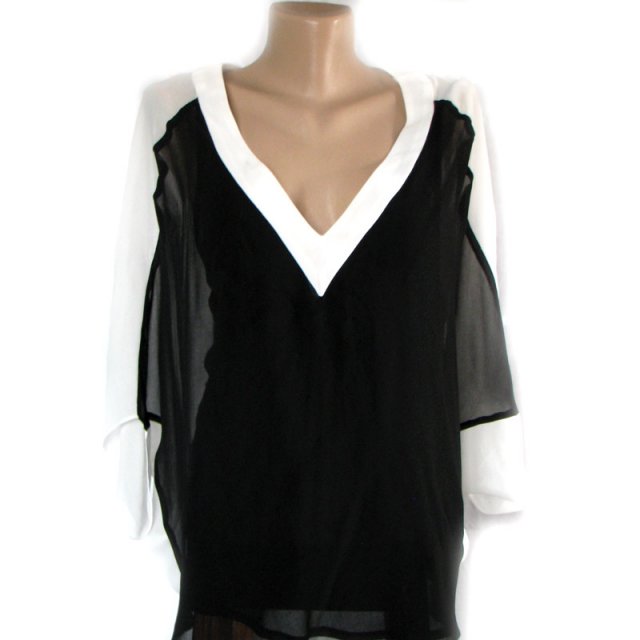 Dwuwarstwowa bluzka o kształcie nietoperza, z przylegającym od spodu topem na ramiączkach. Dekolt w szpic. Długość mierzona od ramienia 63 cm.