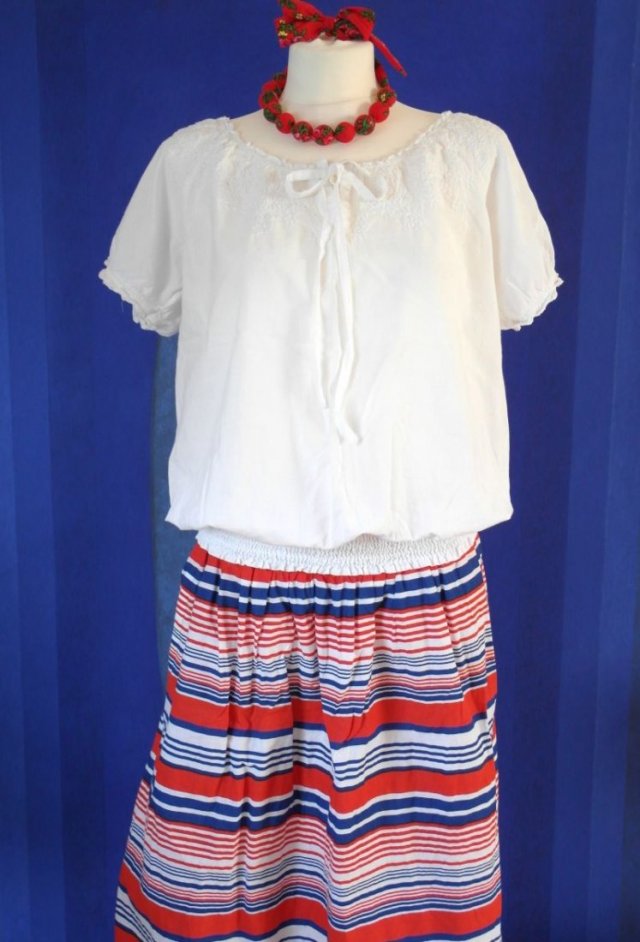 Haftowana przy dekolcie, rękawki bufki, ściągacz z gumek u dołu.