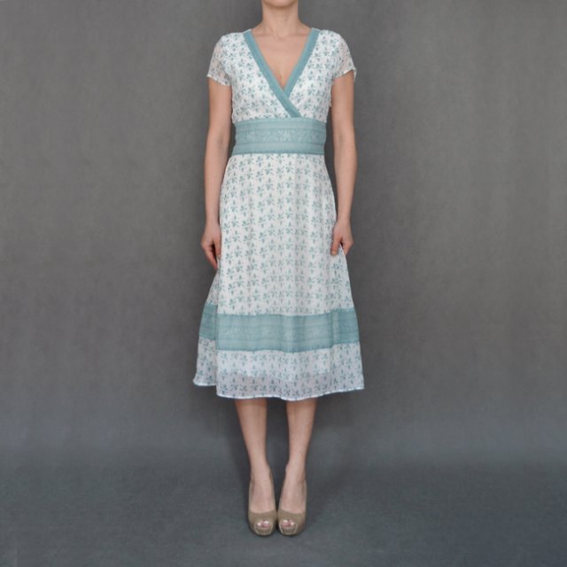 Sukienka w biało miętowych kolorach. Zwiewna, za kolana, wiązana z tyłu. Na podszewce. Marka VERO MODA