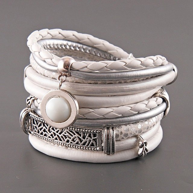Ta wygodna i elegancka bransoletka została wykonana z różnych rzemyków w kolorach białym i srebrnym.