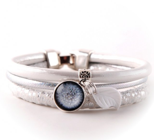 Delikatna, stylowa bransoletka wykonana z błyszczących i nakrapianych rzemyków w kolorach białym i srebrzystym.