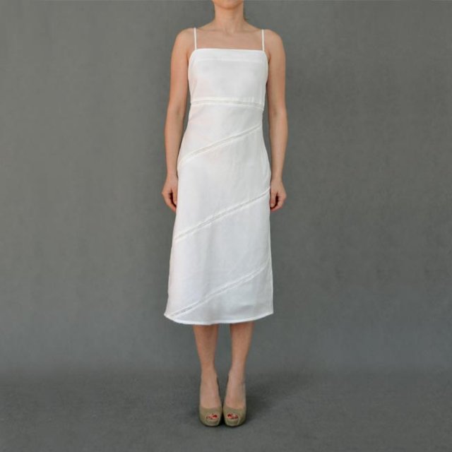 Bardzo dyskretna bialutka sukienka z lnu. Bardzo prosta w swojej formie, ozdobiona ukośnymi koronkowymi wstawkami. Polecam.