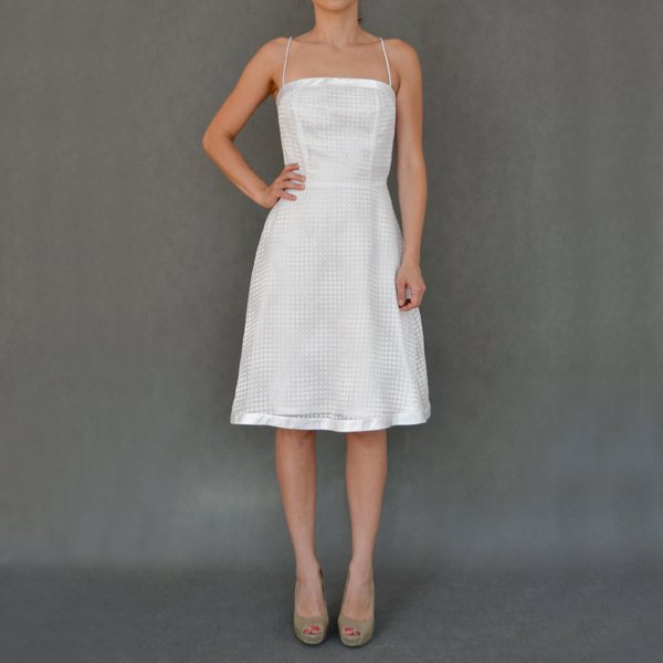 Sliczna biała sukieneczka na cieniutkich ramiączkach marki H&M. Wykonana z transparentnego materiału w białe tłoczone kropeczki. Na podszewce. Wykończona satynowymi tasiemkami. Z tyłu wiązana. Polecam. Fajnie wygląda przełamana ramoneską lub obszernym, długim swetrem.
