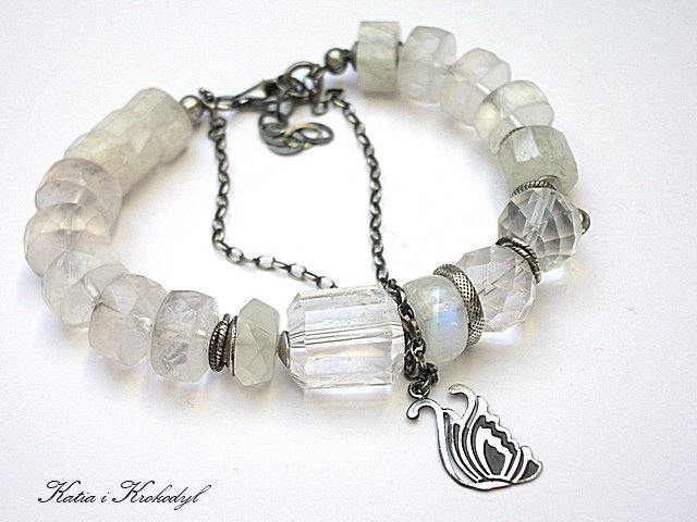 Bransoletka wykonana ze srebra [pr.925] w połączeniu z fasetowanymi oponkami kwarców [10mm] ,fasetowanymi walcami kwarców różowych [12mm],unikatowymi walcami walcami kamienia księżycowego [ 12-13mm] ,oponką kamienia księżycowego [12mm] ,fasetowanymi kuleczkami kwarców różowych [12mm] ,nieforemna bryłką kryształu górskiego z inkluzjami [15mmx 12mm] oraz srebrnymi przywieszkami.Całość oksydowana i przetarta.Całkowita długość bransoletki 20cm plus 3cm przedłużki. .Pasuje na nadgarstek 16-17cm.Biżuteria ozdobnie zapakowana.Bransoletka może stanowić komplet z innymi bransoletkami -przykładowe zdjęcia.