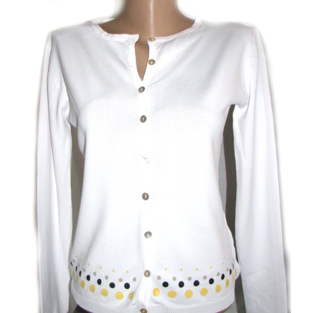 Damski sweterek o prostym kroju, z okrągłym dekoltem zapinany na guziczki z masy perłowej.Wymiary na płasko: długość mierzona przodem od ramienia 54 cm, biust 42 cm, talia 40 cm, rękaw mierzony po wewnętrznej stronie 49 cm.