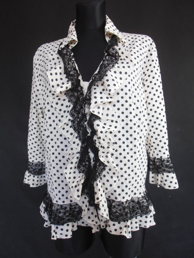 Bluzka firmy BiBA.Rozmiar 16,nasz 42-44.Materiał bawełna.Zapinana z przodu na plastykowe zatrzaski.Rozcięcie obszyte falbaną i falbaną z czarnej koronki.W koło szyi kołnierz na stójce.Dół i rękawy również wykończone falbanami.Rękaw długi,szeroki,przed falbaną tunel z wciągniętym paskiem do ściągania.Tył na środku sznurowany.Stan bardzo dobry.Długość 64 cm.pod pachami 114 cm.