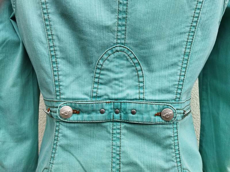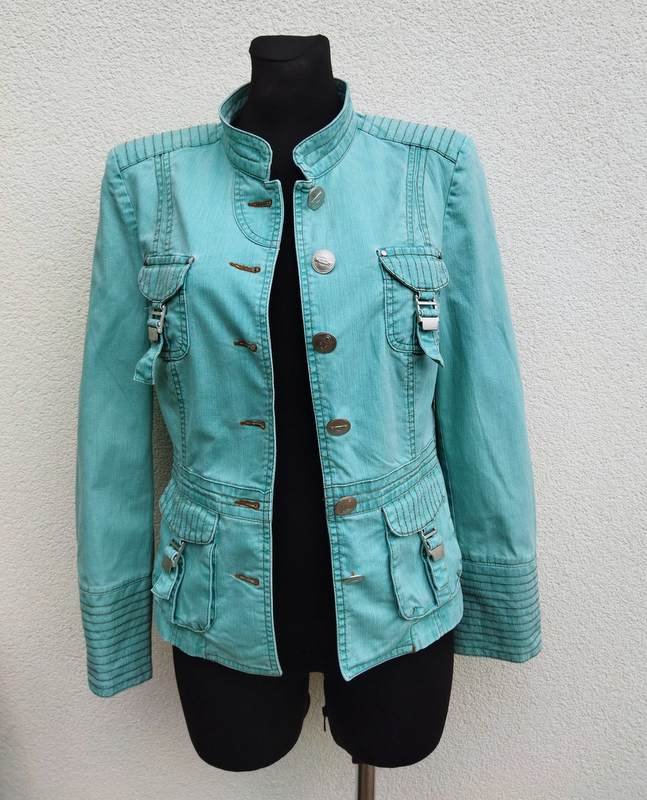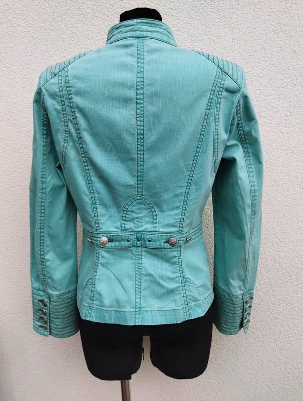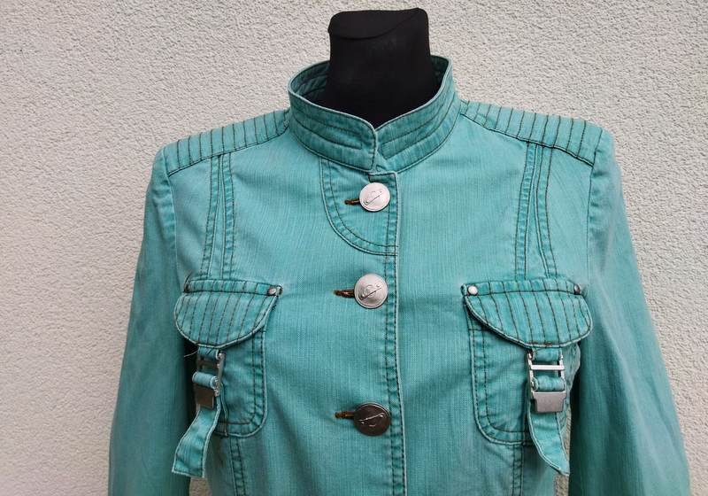 Świetna kurtka lub marynarka z bawełnianej tkaniny w turkusowo-miętowym kolorze . Starannie odszyta z licznymi detalami, obficie stębnowana kontrastową nicią. Odcinana w pasie, z karczkiem na ramionach, z czterema naszywanymi przestrzennymi kieszeniami zapinanymi na paseczki z klamerką Z tyłu naszywany pasek -patka z nitami i guzikami. Zapinana na oryginalne guziki w matowym srebrnym kolorze, takie same tylko mniejsze na wysokich mankietach rękawów. Bez podszewki.