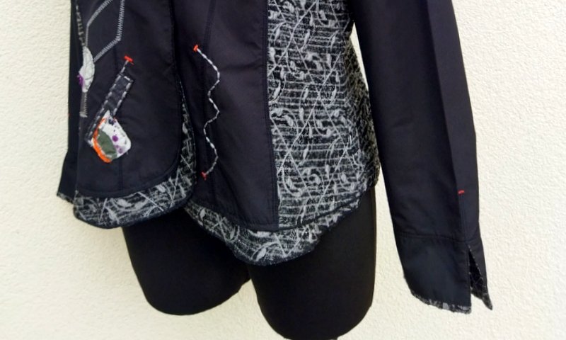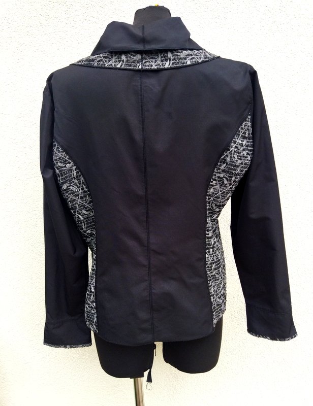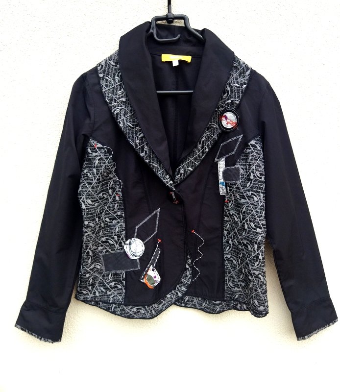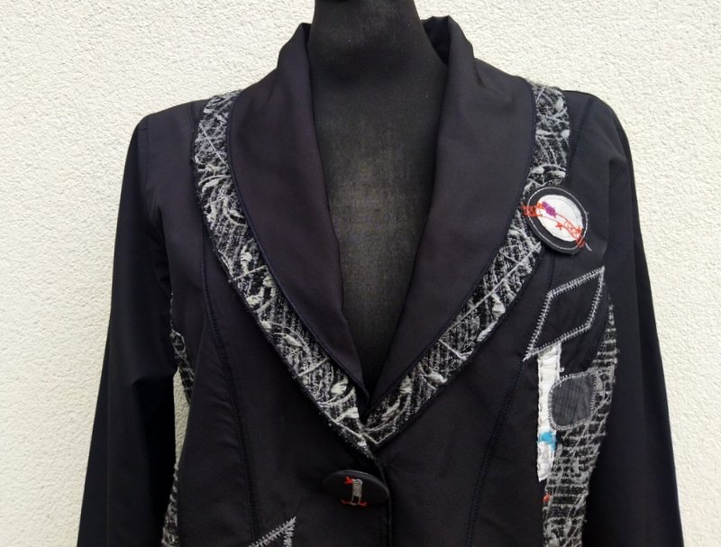 Designerka marynarka z łączonych materiałów : jednobarwnej czarnej poliestrowej tkaniny i wzorzystej czarno srebrzysto-szarej z wypukłą fakturą. Starannie uszyta z licznymi elementami zdobniczymi naszywane aplikacje , ozdobne przeszycia i stębnowania. Taliowana z wykładanym podwójnym kołnierzem, z lekko zaokrąglonymi połami przodu. Zapinana na jeden duży zdobiony guzik. Bez podszewki.