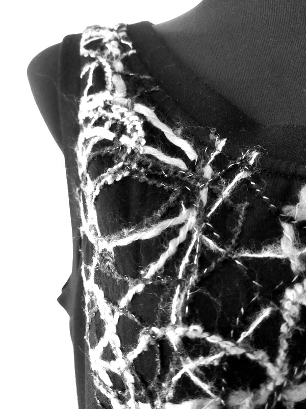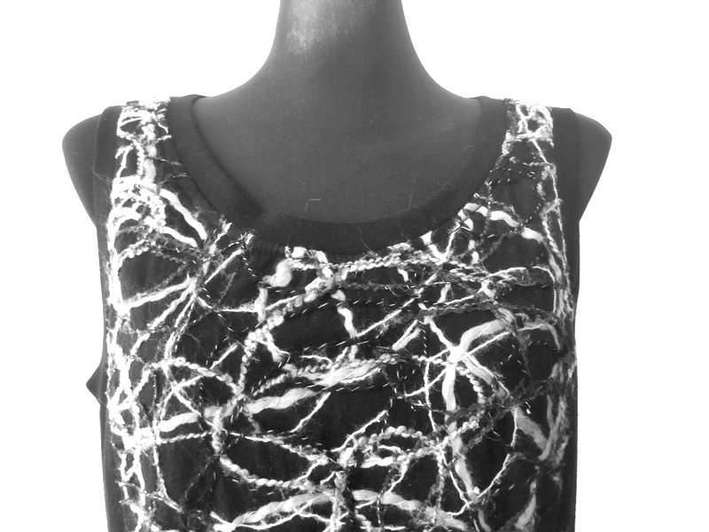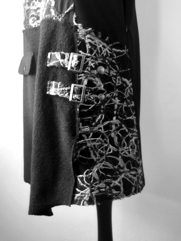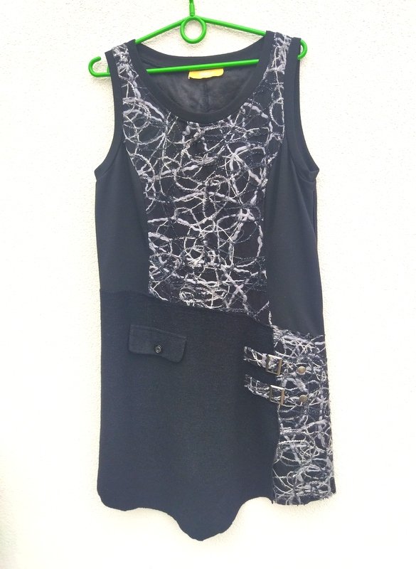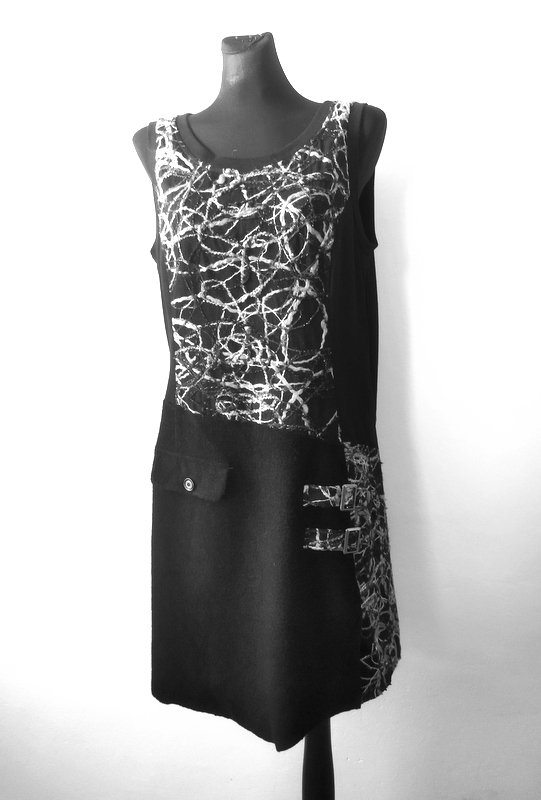 Ciekawa sukienka z łączonych tkanin w czarnym kolorze: dzianinowej gładkiej z haftowanymi wstawkami szarą, czarna i i biała włóczką oraz grubszej czarnej tkaniny z faktura drobne boucle. Zapinana z boku na zamek , u dołu z jednego boku naszywana patka z guzikiem imitująca kieszeń, z drugiego boku rozcięcie na linii kolana i dwie naszywane paski z klamerkami imitującymi zapięcie. Asymetryczna- ukośnie skrojony przód dłuższy od tyłu. Bez podszewki.