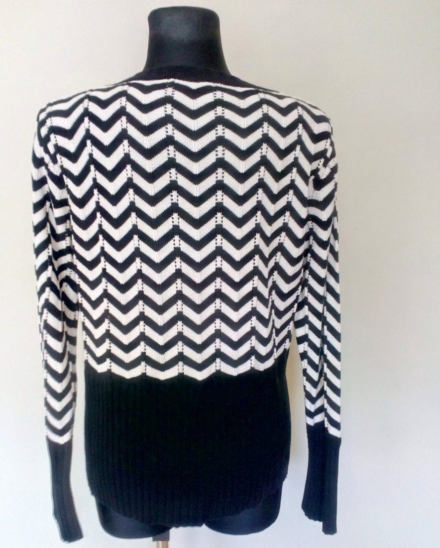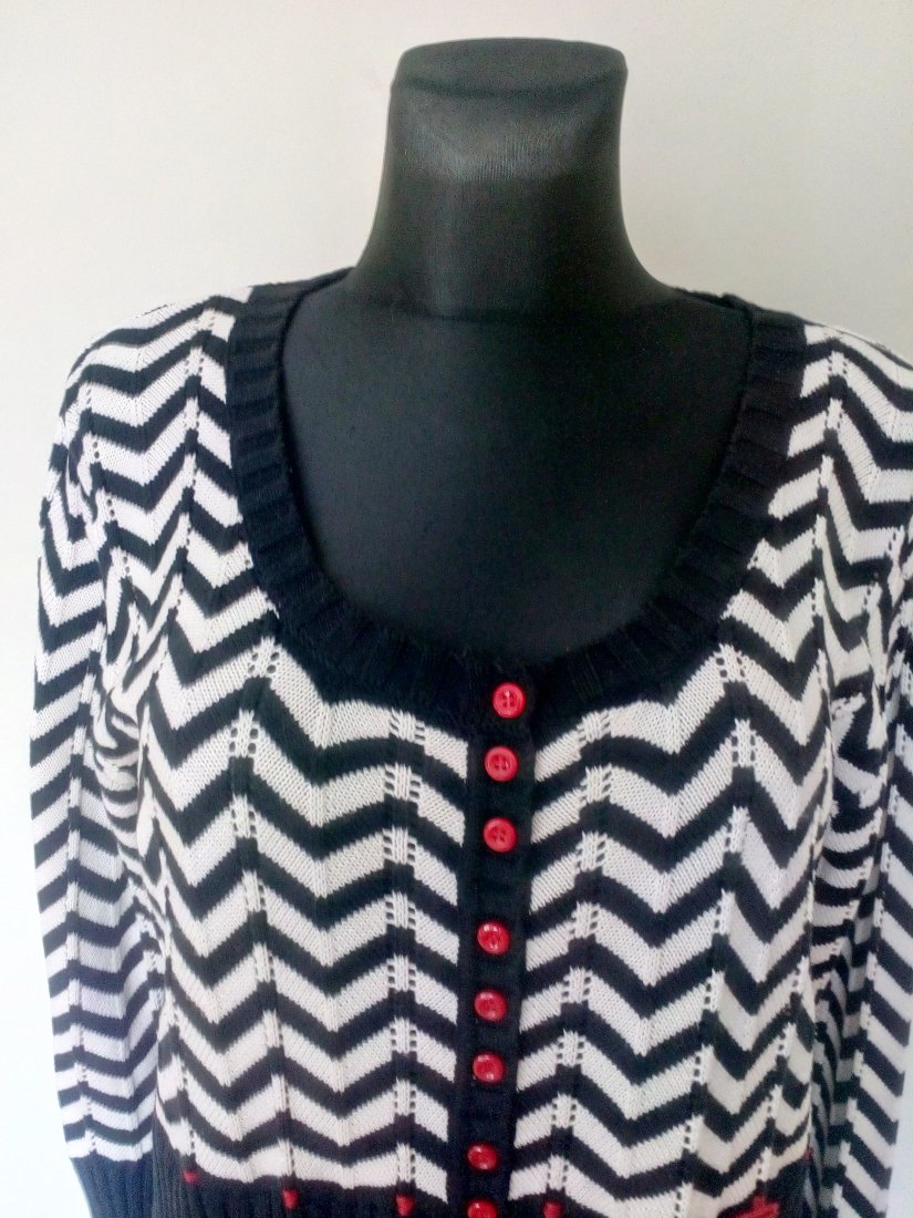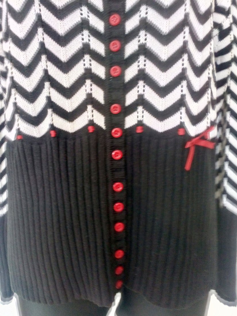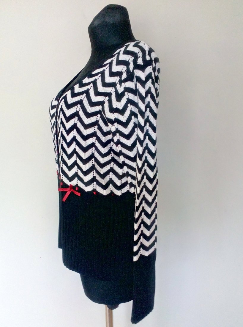 Biało-czarny sweterek z czerwonymi akcentami, zapinany na przodzie, wzór z delikatnym ażurem, u dołu wysoki ściągacz