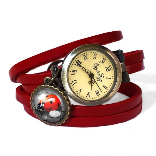Zegarek ze skórzanym paskiem kilkakrotnie zakręcanym na ręku z ręcznie robioną zawieszką (kaboszonem).