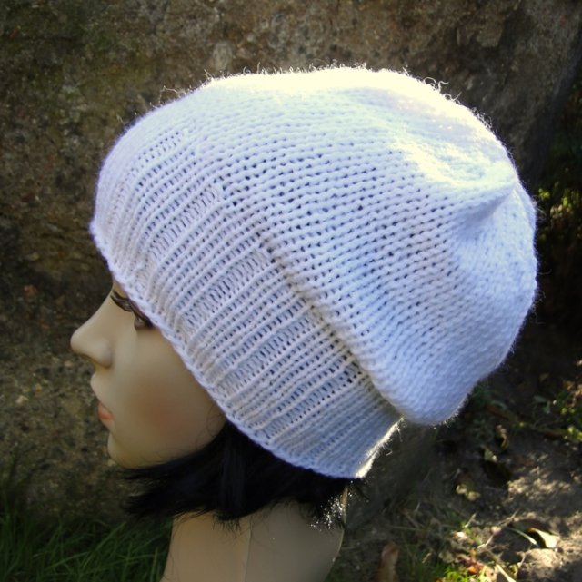 Czapa wykonana ręcznie na drutach z białej włóczki o delikatnie kremowym odcieniu