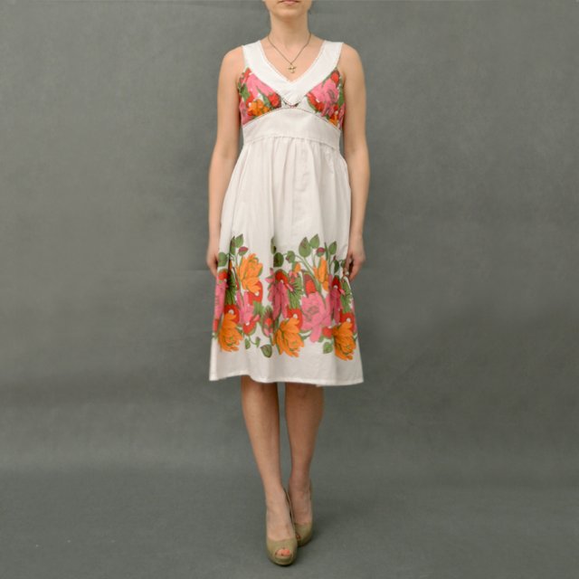 Letnia sukienka w białym kolorze w kolorowe kwiaty. Wykończona przy dekolcie szydełkowymi kuleczkami. Odcięta pod biustem. Na podszewce. Z boku zameczek.