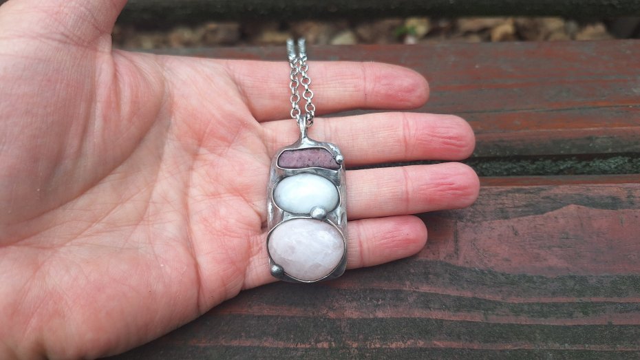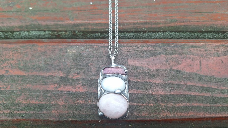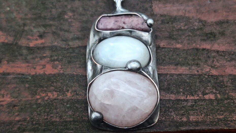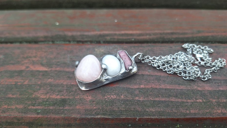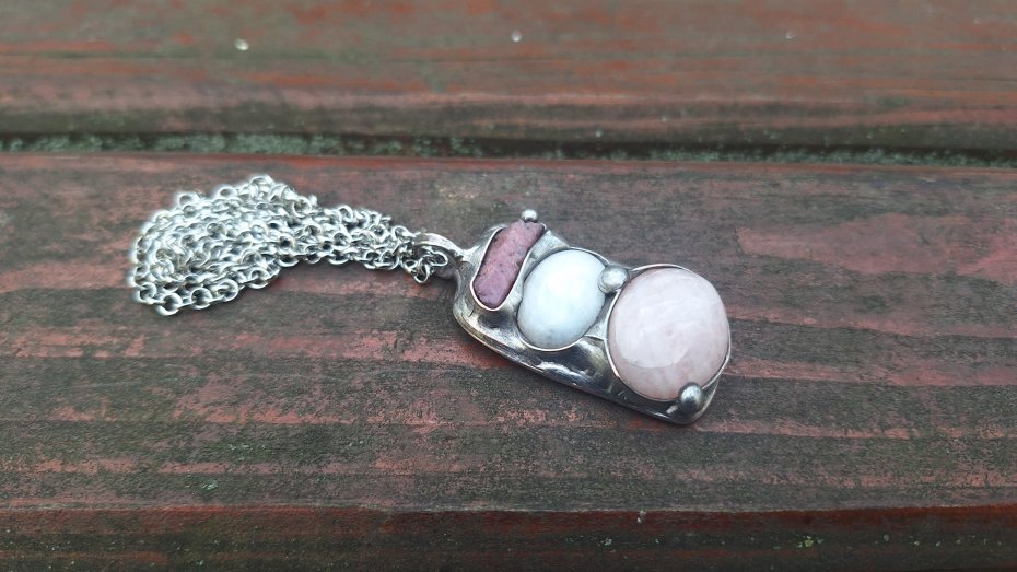 Wisiorek wykonany z miedzi, cyny, rubinu, różowego kwarcu i kamienia księżycowego. Wymiary ok. 4.5 na 2.5 cm. Zawieszony na łańcuszku o długości ok. 50 cm.