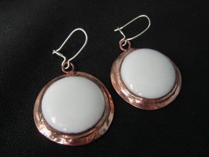 Kolczyki wykonane ze szkła, w otoczce z metalu, patynowane na kolor miedzi. Bigle posrebrzane. Średnica ok. 2,5 cm.
