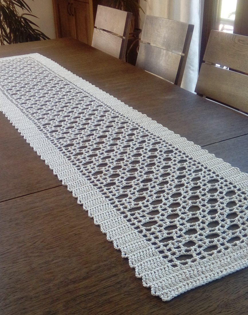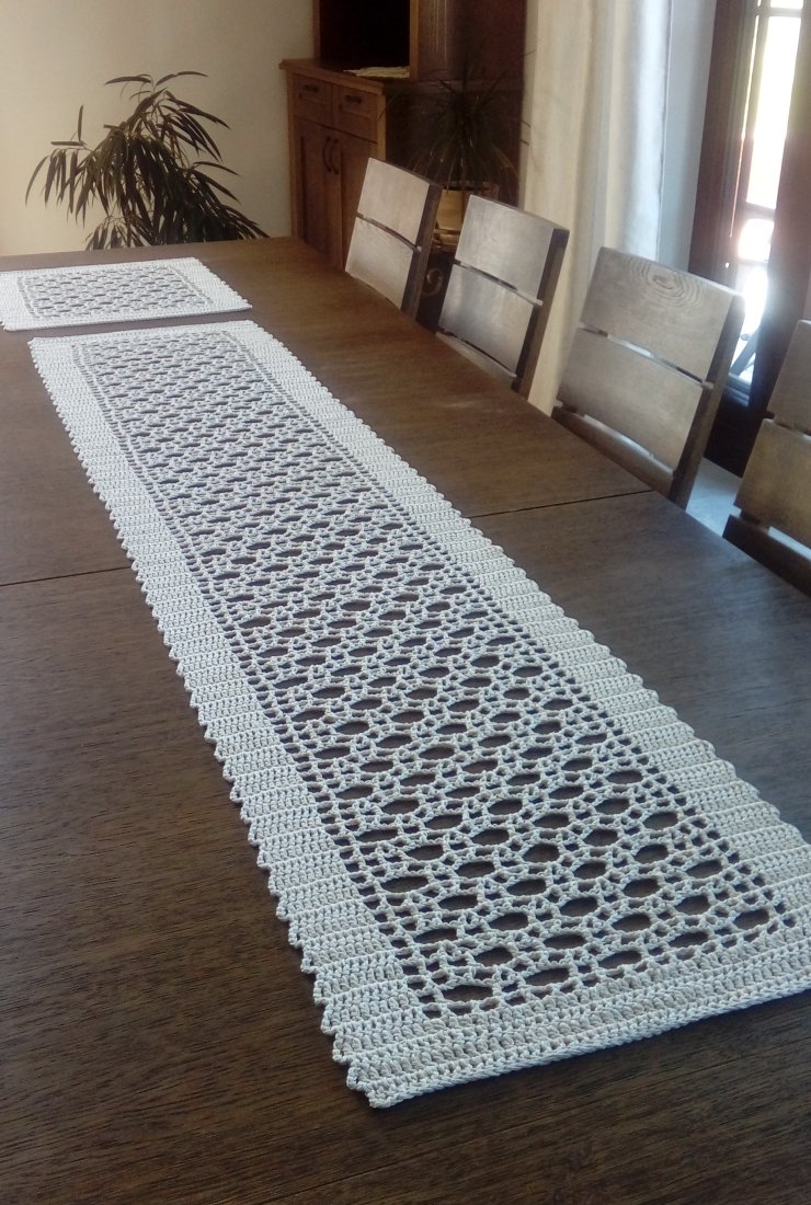 Komplet bieżnik z serwetą wykonany ręcznie w kolorze ciepłego beżu. Łączy w sobie nowoczesność formy z tradycyjną techniką wykonania. Wkomponuje się w każde wnętrze, szczególnie dobrze wygląda na długim stole. Wymiary: bieżnik 40 cm x 170 cm, serweta 45 cm x 45 cm. Bawełna 100%. Autorski projekt i wykonanie.
