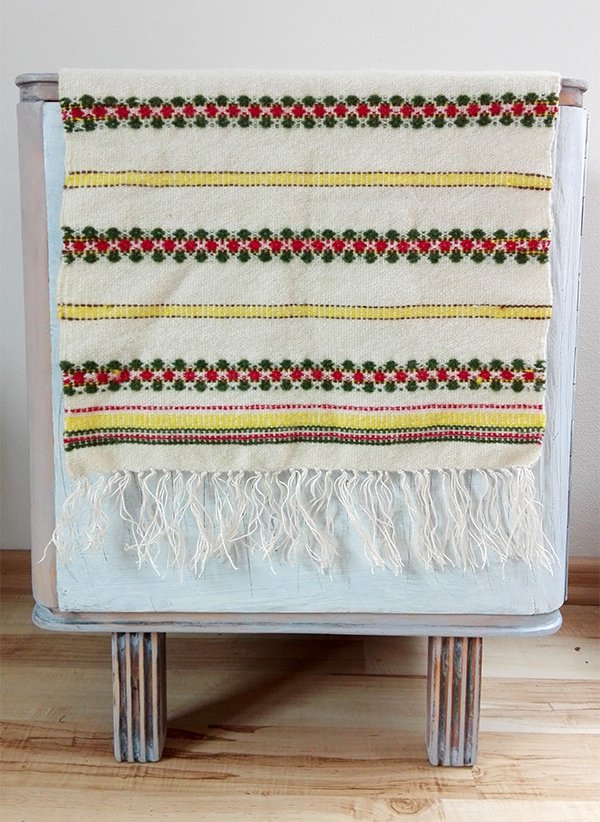 Bieżnik vintage, tkany z naturalnej wełny, wykończony bawełnianymi frędzlami.